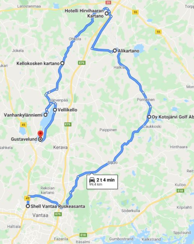 Reitin pituus on noin 100 km päättyen Tuusulanjärven eteläpäässä sijaitsevan Gustavelundin kartanon terassille jossa kahvit tarjolla osallistujille ja mahdollisuus turinoida asiasta ja sen vierestä.